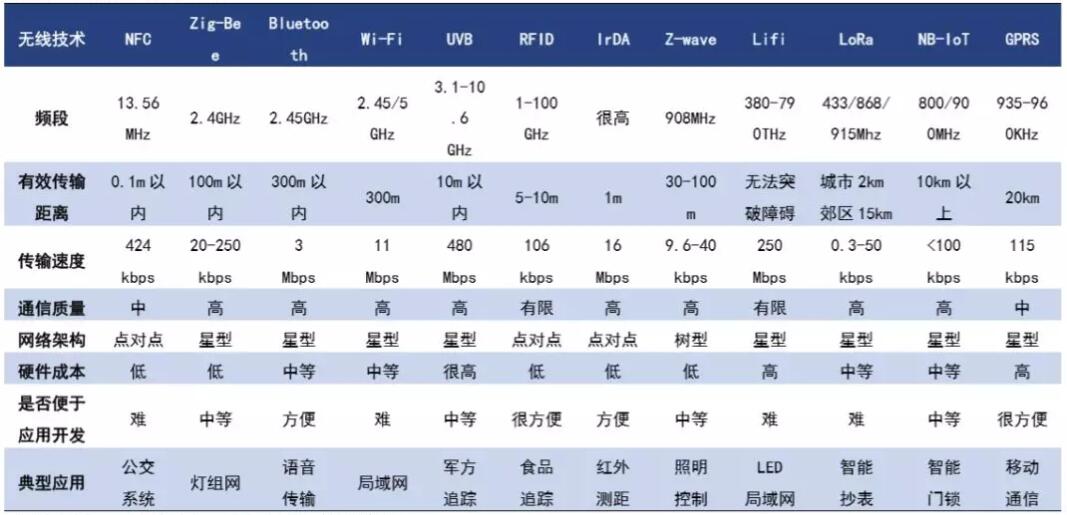 無(wú)線(xiàn)通信技術(shù)主要分廣域網(wǎng)和局域網(wǎng)兩種,具體差別在傳輸距離和通信協(xié)議方面。局域網(wǎng)無(wú)線(xiàn)通信技術(shù)包括、WIFI、藍(lán)牙、ZigBee、UWB、RFID、LiFi等,傳輸一般在0-300米;廣域網(wǎng)無(wú)線(xiàn)通信技術(shù)包括GPRS、LoRa、NB-IoT等,有效傳輸距離在公里級(jí)。藍(lán)牙是最主要的局域網(wǎng)(短距離)無(wú)線(xiàn)通信方式之一,適合覆蓋距離在百米以?xún)?nèi)、數(shù)據(jù)傳輸量較小的通信。