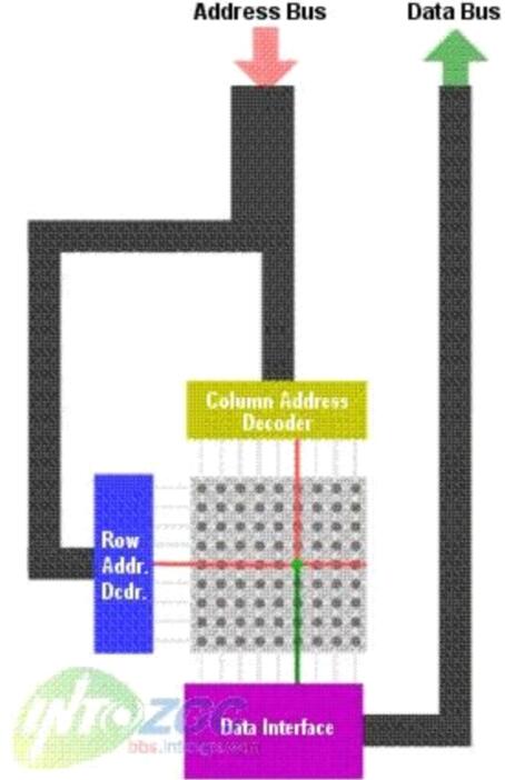 需要注意的是RAM內的部存儲信息的矩陣并不是一個正方形的,也就是行和列的數(shù)目不是相同的--行的數(shù)目比列的數(shù)目少(DRAM)。