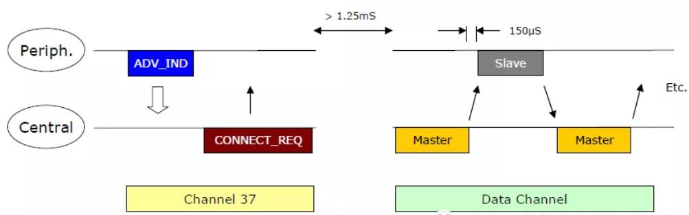 低功耗藍牙芯片特有的設計,也是其快速建立連接的基礎。低功耗藍牙設備之間建立連接的過程如下: