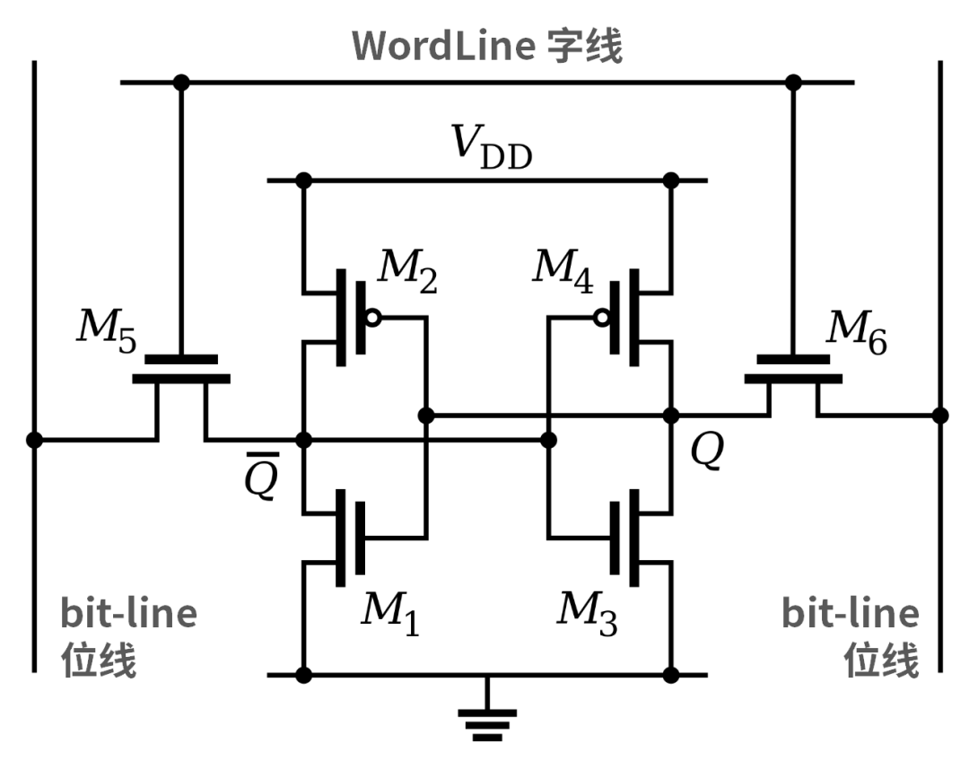 SRAM的基本單元,則最少由6管晶體管組成:4個場效應(yīng)管(M1,M2,M3,M4)構(gòu)成兩個交叉耦合的反相器,2個場效應(yīng)管(M5,M6)用于讀寫的位線(BitLine)的控制開關(guān),通過這些場效應(yīng)管構(gòu)成一個鎖存器(觸發(fā)器),并在通電時鎖住二進(jìn)制數(shù)0和1。因此,SRAM被稱為“靜態(tài)隨機存儲器”。