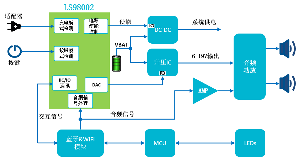 現(xiàn)場(chǎng)可重構(gòu)IC、通用可配置的模數(shù)混合芯片內(nèi)部集成豐富的模擬資源和數(shù)字資源,可輕松替代電路中的各種標(biāo)準(zhǔn)器件,并按照客戶要求組合成最優(yōu)小型ASIC,縮短開(kāi)發(fā)周期,降低成本。下面介紹LS98002現(xiàn)場(chǎng)可重構(gòu)CPLD芯片應(yīng)用案例—藍(lán)牙音箱。