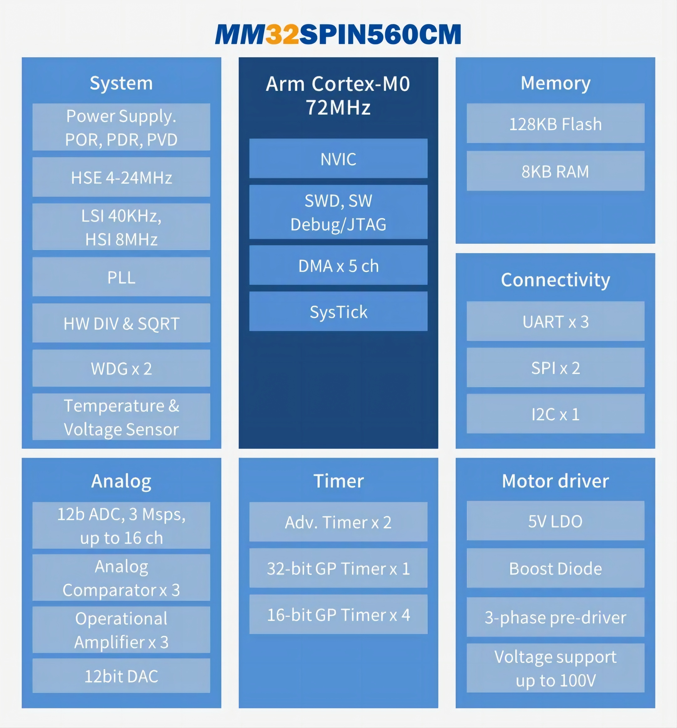 MM32SPIN560CM集成100V耐壓6N預驅,通過AEC-Q100認證,使用高性能的Arm®Cortex-M0為內核的32位微控制器,最高工作頻率可達72MHz。