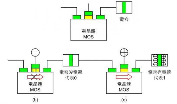 DRAM 使用一個(gè)電晶體(MOS)與一個(gè)電容來(lái)儲(chǔ)存一個(gè)位的資料(一個(gè) 0 或一個(gè) 1),如圖四(a)所示,當(dāng)電晶體(MOS)不導(dǎo)通時(shí)沒(méi)有電子流過(guò),電容沒(méi)有電荷,代表這一個(gè)位的資料是 0,如圖四(b)所示;當(dāng)電晶體(MOS)導(dǎo)通時(shí)(在閘極施加正電壓),電子會(huì)由源極流向汲極,電容有電荷,代表這一個(gè)位的資料是 1,為了要將這些流過(guò)來(lái)的電荷“儲(chǔ)存起來(lái)”,因此必須使用一個(gè)微小的電容,如圖四(c)所示,DRAM 就是因?yàn)殡娙菪枰獣r(shí)間充電,所以速度比 SRAM 還慢。